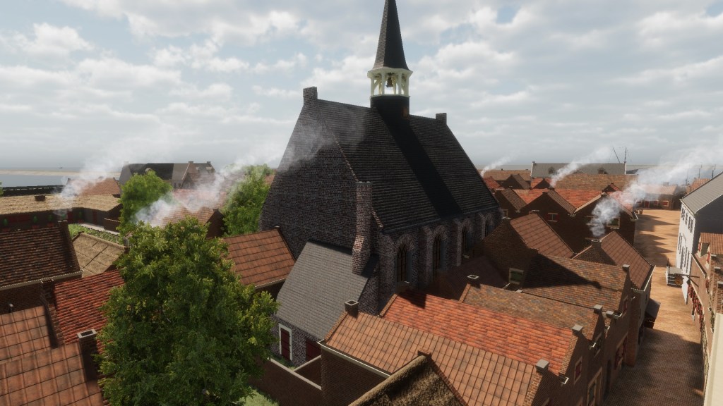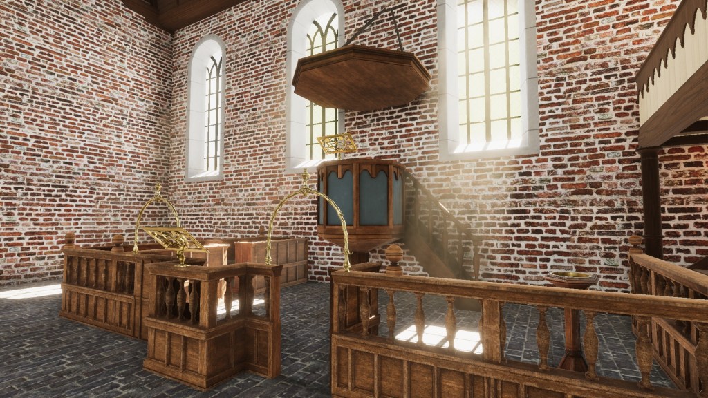 Op het centrale marktplein vind je de protestantse kerk van het fort. We hebben dit gebouw ingericht naar analogie met andere protestantse tempels die in het midden van de 17de eeuw worden gebouwd, want er is weinig geweten van het interieur van deze kerk. In die tijd staan de meeste kerkgangers recht, vrouwen en ouderen zitten neer op eenvoudige lage banken en de notabelen hebben hun “herenbank”. In de dooptuin rondom de preekstoel vind je natuurlijk de doopvont maar ook de banken van de leden van de kerkenraad en de lezenaar van de voorzanger.
